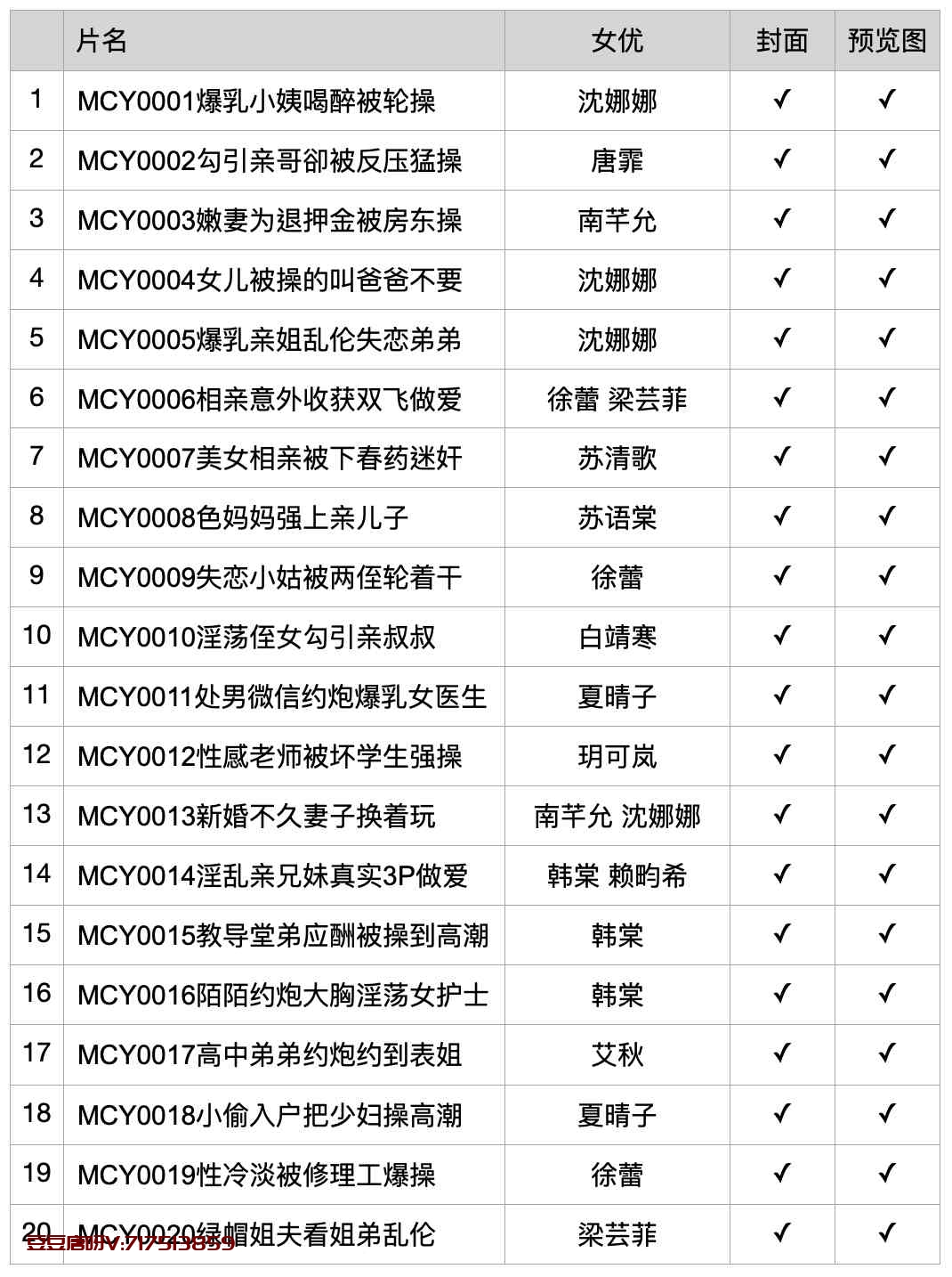 麻豆的这个MCY系列是今年5月份才开始发行的,短短一个月时间里已经发了20部片子。看到水印大家都知道又是那个大赞助商的手段了。虽说水印大又多,但麻豆的出品肯定是信心保证!这系列用的都是麻豆的资深女优,内容也是环绕家庭的,可能这样比较容易操作,也可以迅速的在短期内制作出品。系列不错,都是大家熟悉的女优再一次在镜头前证明自己的价值!